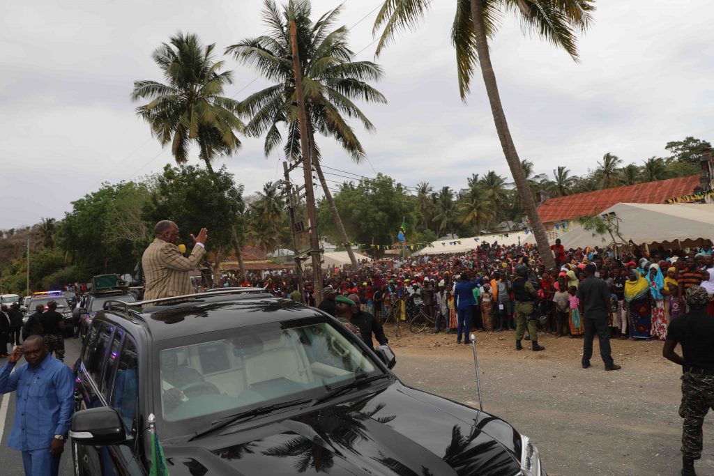 Rais wa Jamhuri ya Muungano wa Tanzania Dkt. John Pombe Magufuli akisalimiana na wananchi wa Mji wa Mikindani waliokuwa wakisherehekea Siku ya Mikindani katika tamasha kubwa la utamnaduni la Urithi wakati akiwa njiani kuelekea mkoani Lindi kuhudhuria sherehe za kilele cha Mbio za Mwenge wa Uhuru na kumbukumbu ya Miaka 20 ya Kifo cha Baba wa Taifa Mwalimu Julius Nyerere