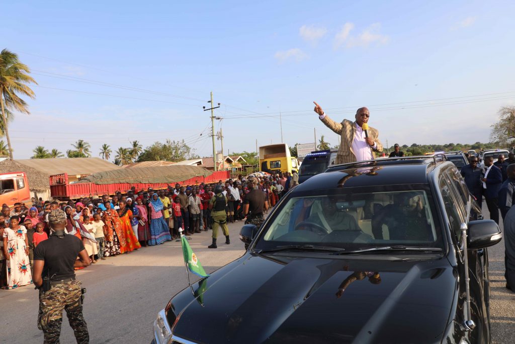 Rais wa Jamhuri ya Muungano wa Tanzania Dkt. John Pombe Magufuli akisalimiana na wananchi wa kijiji cha Mnazi Mmoja akiwa njiani kuelekea mkoani Lindi kuhudhuria kwenye sherehe za kilele cha Mbio za Mwenge wa Uhuru na kumbukumbu ya Miaka 20 ya Kifo cha Baba wa Taifa Mwalimu Julius Nyerere