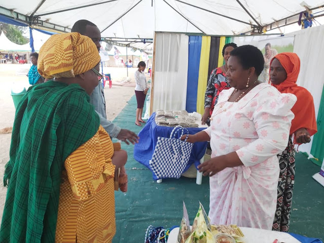 Mama Shujaa wa chakula kutoka mkoani Mtwara akimuuzia vikapu Dkt. Nchimbi alivyotengeneza kama mjasiriamali mdogo ili kukuza kipato cha familia yake.