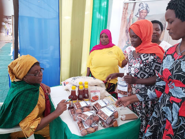 Mama Shujaa wa chakula kutoka Shirika la Oxfam, Stella Masulya akimuelekeza Mkuu wa Mkoa wa Singida Dkt. Rehema Nchimbi namna ya anavyohofadhi samaki wake kwa kutumia moshi na anavyoandaa dagaa kwa njia ya asili katika maonesho ya kuadhimisha siku ya chakula duniani yanayoadhimishwa kitaifa mkoani Singida.