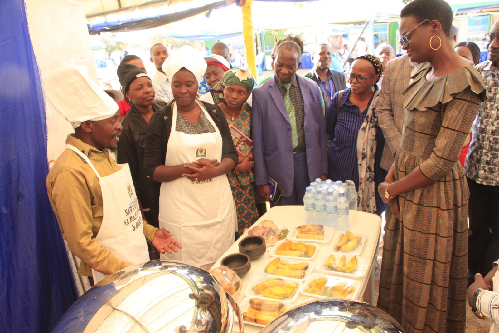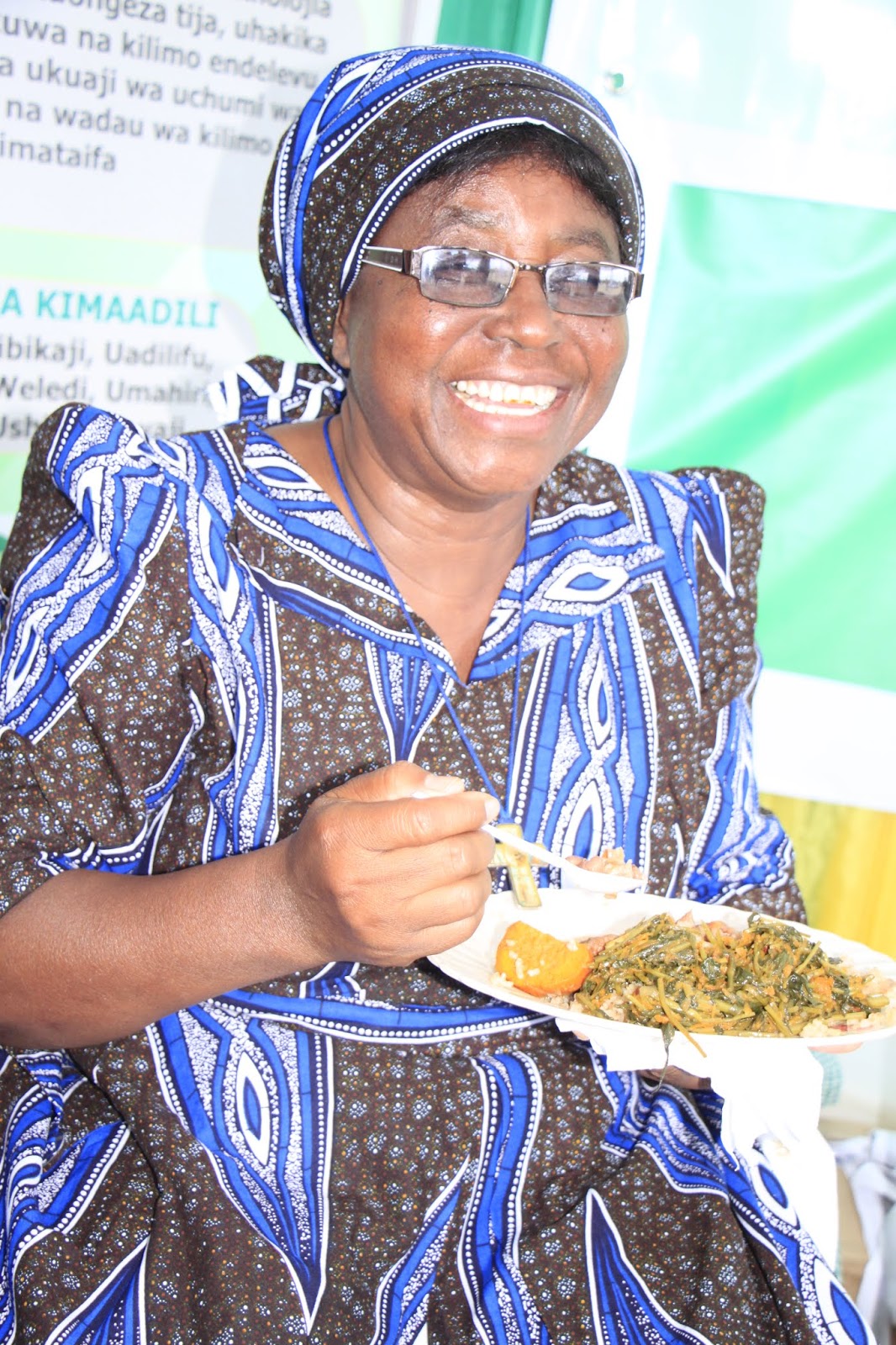 Mkuu wa Mkoa wa Singida, Dkt.Rehema Nchimbi akila chakula cha asili kilichotengenezwa na Taasisi ya Utafiti wa Kilimo Tanzania (TARI)