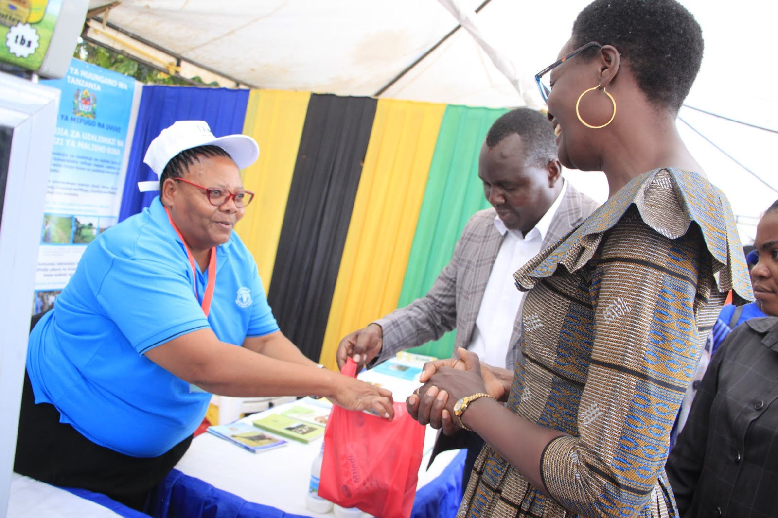 Afisa Mifugo Wizara ya Mifugo na Uvuvi, Mary Yongolo akimpatia zawadi ya maziwa Dkt.Tulia Ackson baada ya kutembelea banda la wizara hiyo.