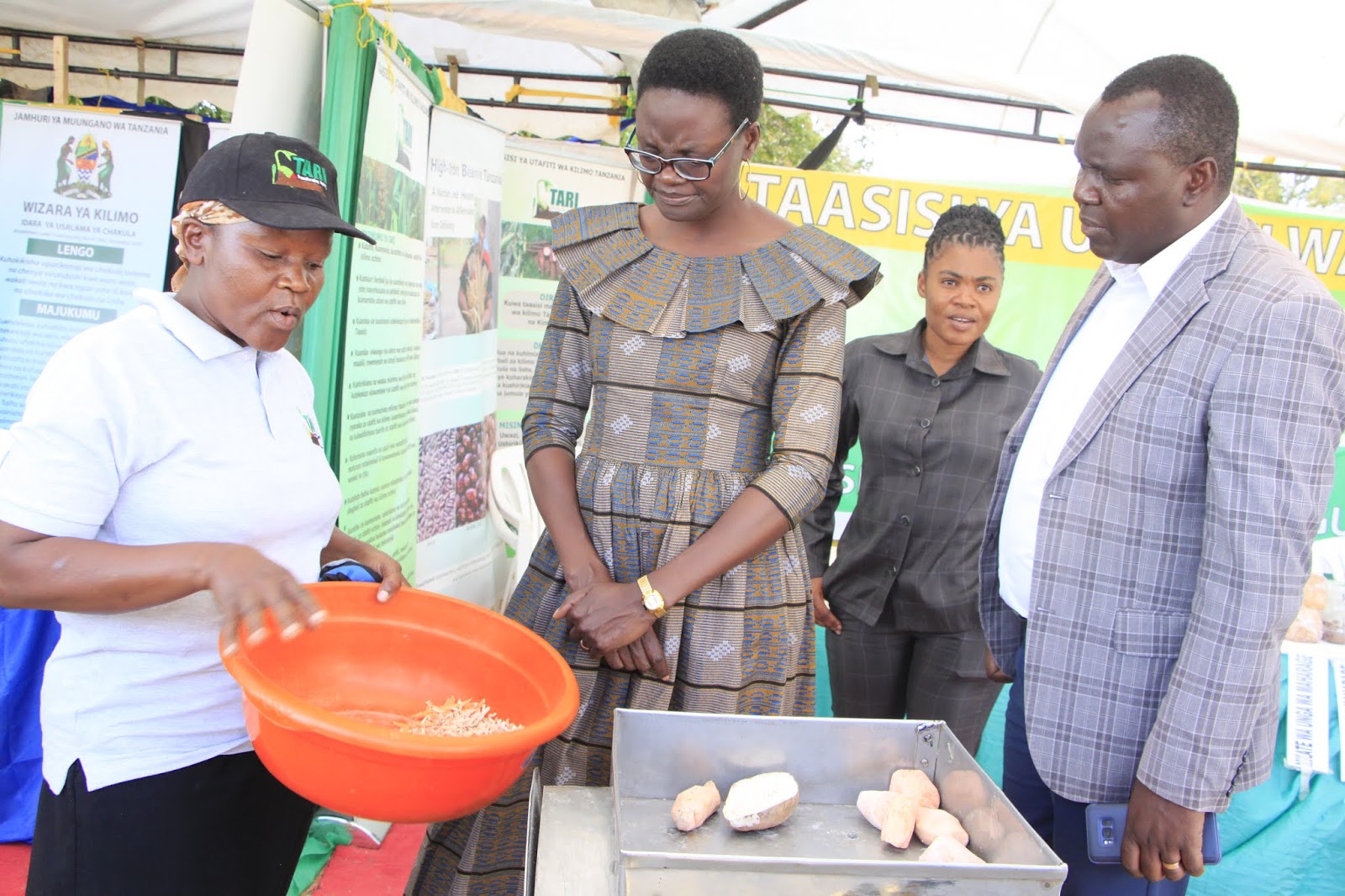 Dkt. Tulia akipata maelezo jinsi mashine ya kuchakata viazi lishe inavyofanya kazi katika banda la TARI. Kulia ni Mkuu wa Wilaya ya Singida, Pasacas Muragiri.