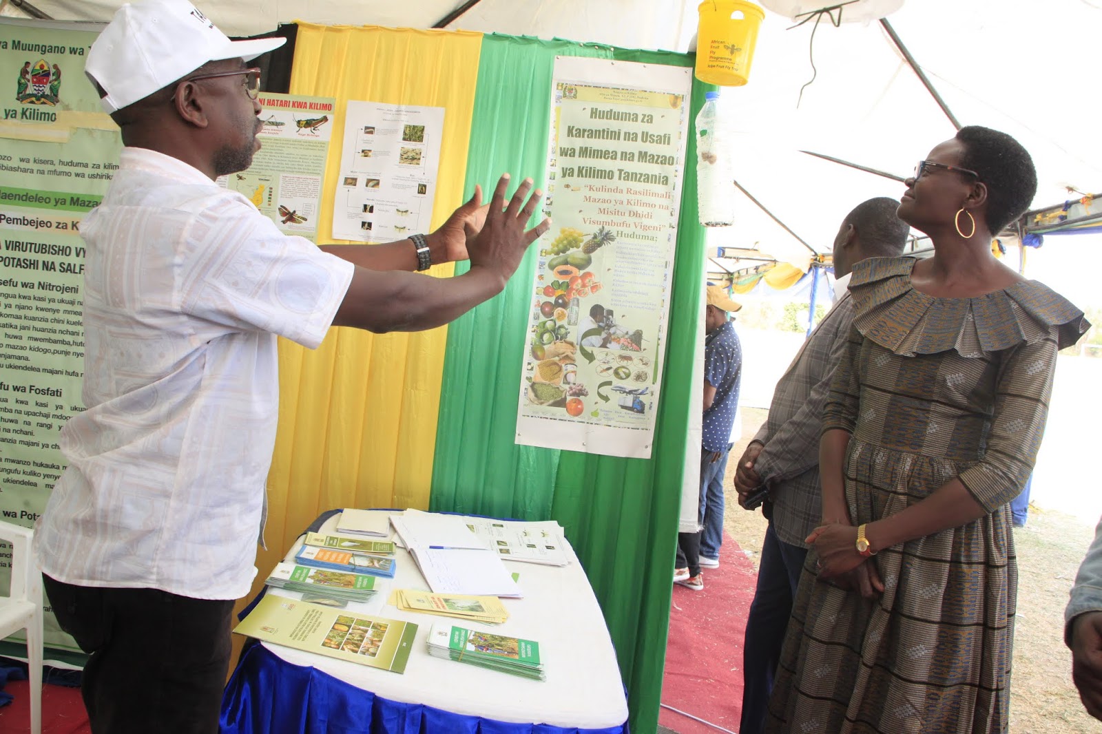 Afisa Kilimo Robert Dimoso Idara ya Usalama wa Chakula Wizara ya Kilimo akimuelezea Dkt.Tulia shughuli zinazofanywa na Idara hiyo.