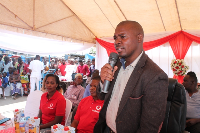 Mgeni rasmi mwakilishi wa mkuu wa mkoa wa Tabora, Katibu Tawala msaidizi anayeshughulikia Utawala, Hamisi Mkunga akizungumza na wananchi katika hafla ya uzinduzi wa duka la Vodacom mjini Tabora.