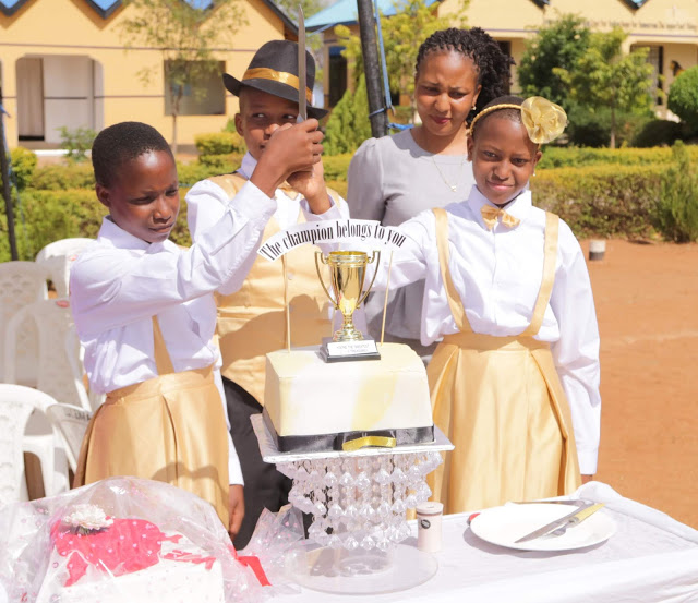 Watahiniwa bora kitaifa matokeo ya mtihani darasa la saba 2019 kutoka shule ya Msingi Little Treasures (Daniel Ngassa katikati aliyeshika nafasi ya saba kitaifa) na Wanafunzi wa kike ambao ni miongoni mwa wanafunzi bora kitaifa katika matokeo ya darasa la saba 2019 Suzane Assenga (kulia) na Scolastica Shelembi (kushoto) wakikata keki.