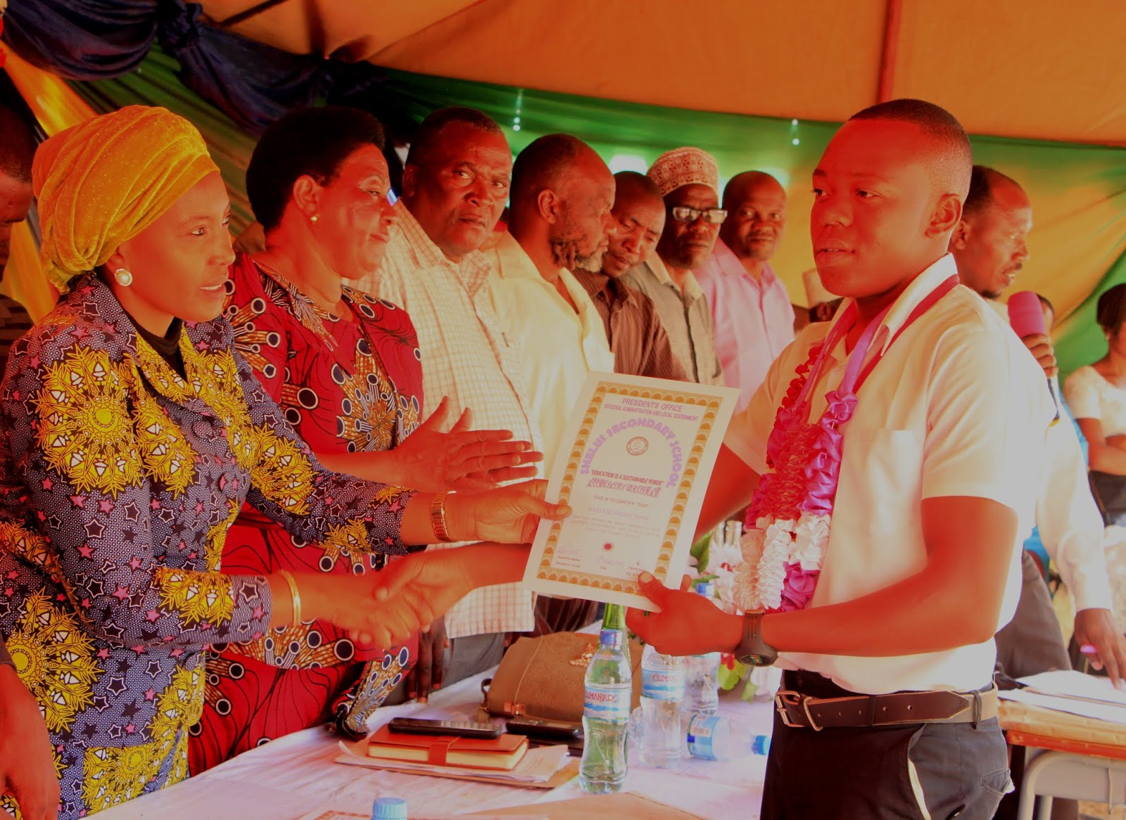 Mhe.Mattembe akimkabidhi cheti cha Taaluma Mhitimu, Hassan Juma.