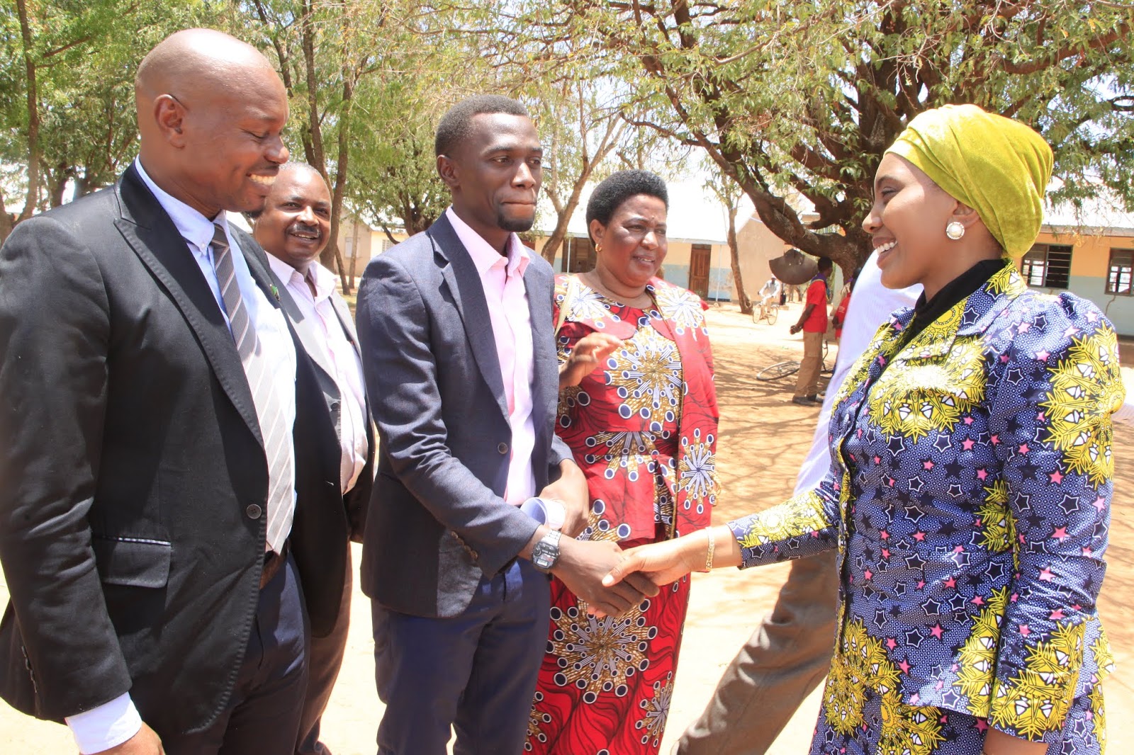 Mbunge Mattembe akisalimiana na mkuu wa shule hiyo, Mwalimu Elly Nguma. Kutoka kushoto ni Diwani wa Kata ya Shelui Kinota Hamisi, Afisa Elimu Kata Swetu Makula na Diwani wa Viti Maalumu wa Kata hiyo, Jenipher Miano.