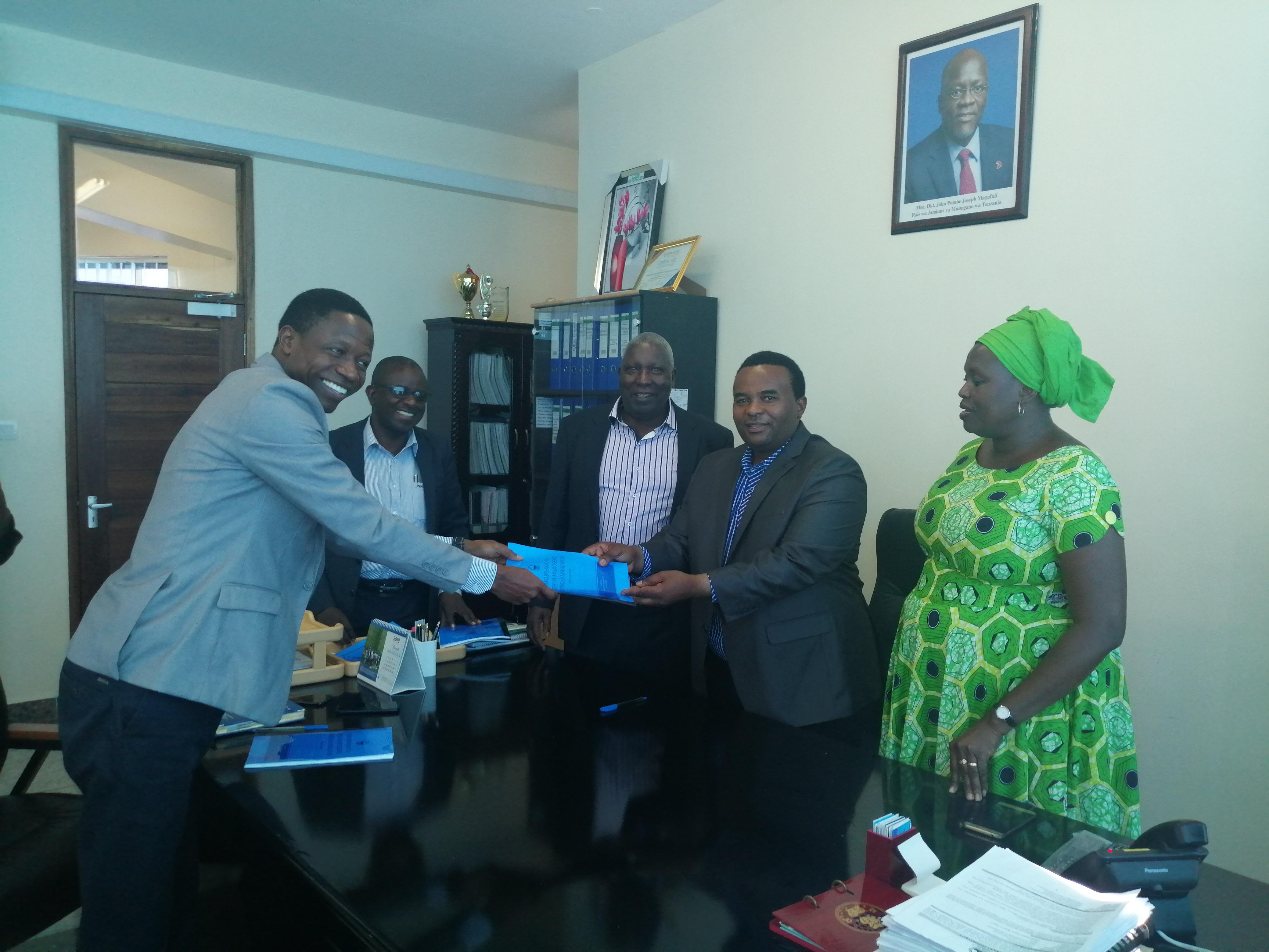 Naibu Katibu Mkuu Wizara ya Maji, Mhandisi Anthony Sanga (katikati kulia) akimkabidhi nyaraka za makabidhiano ya Ofisi Kaimu Mkurugenzi Mtendaji wa MWAUWASA, Mhandisi Leonard Msenyele (kushoto). Wanaoshuhudia ni Mwenyekiti wa Bodi ya Wakurugenzi MWAUWASA, Christopher Gachuma (wa pili kushoto) na Makamu wake, Edith Mudogo (wa kwanza kulia).