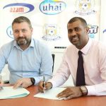 Naibu Katibu Mkuu Wizara ya Maji, Mhandisi Anthony Sanga (aliyekaa kulia) na Kaimu Mkurugenzi Mtendaji wa Mamlaka ya Majisafi na Usafi wa Mazingira Jijini Mwanza (MWAUWASA), Mhandisi Leonard Msenyele (kushoto) wakisaini nyaraka za makabidhiano ya Ofisi. Awali Mhandisi Sanga alikuwa Mkurugenzi Mtendaji MWAUWASA.