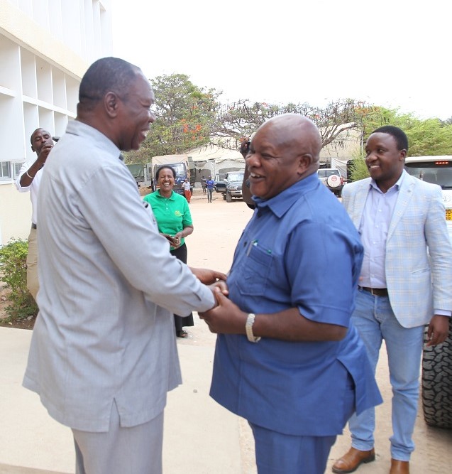 Mkuu wa Mkoa wa Tabora Aggrey Mwanri(kushoto) akimkaribisha Waziri wa Ujenzi, uchukuzi na mawasiliano Mhandisi Isack Kamwelwe (kulia) jana wakati wa ziara yake ya siku moja ya uzinduzi wa mradi wa kuziunganisha shule 14 umma za Mkoa wa Tabora katika mtandao wa tovuti.