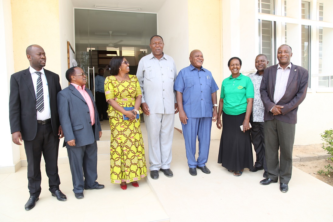 Mkuu wa Mkoa wa Tabora Aggrey Mwanri(wenye suti ya kijivu) akiwa na Waziri wa Ujenzi, uchukuzi na mawasiliano Mhandisi Isack Kamwelwe (mwenye suti ya bluu ) na viongozi wengine katika picha ya pamoja jana wakati wa ziara ya Waziri ya siku moja ya uzinduzi wa mradi wa kuziunganisha shule 14 umma za Mkoa wa Tabora katika mtandao wa tovuti.