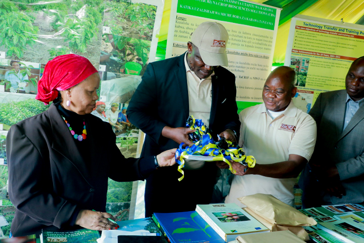 Waziri wa Kilimo Mhe Japhet Hasunga (Mb) akikata utepe kuzindua vitabu vya Taasisi ya utafiti wa Kahawa Tanzania (TACRI) kwa ajili ya kutoa elimu kuhusu kanuni bora za utunzaji wa kahawa aina ya Arabika na Robusta pamoja na mitaala ya mafunzo, leo tarehe 21 Octoba 2019. Wengine pichani ni Mkuu wa Mkoa wa Kilimanjaro Mhe Dkt Anna Mghwira na Mwenyekiti wa Taasisi ya Utafiti wa Kahawa Tanzania (TACRI) Ndg Aloyce Mdalavuma (Picha Zote Na Mathias Canal, Wizara ya Kilimo)