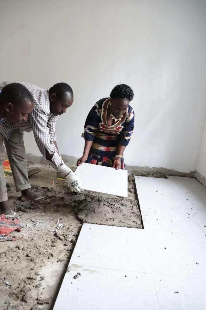Waziri wa Elimu, Sayansi na Teknolojia Profesa Joyce Ndalichako akishiriki katika ujenzi wa Ofisi za Uthibiti ubora wa Shule wilayani Chato alipofika kukagua maendeleo ya ujenzi wa ofisi hiyo.