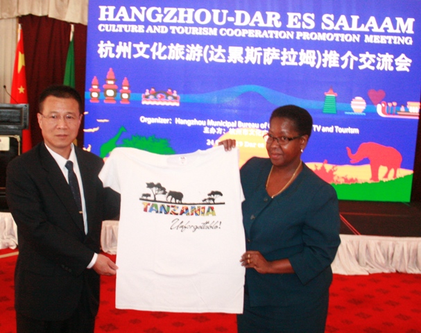 Mkurugenzi wa Bodi ya Utalii nchini(TTB) Devotha Mdachi akimkabidhi zawadi ya Fulana Bw. Qu Bo Naibu Mkurugenzi wa Utamaduni na Utalii jijini Hangzhou nchini China mara baada ya mkutano kati ya wafanyabiashara na mawakala katika sekta ya Utalii kati ya Tanzania na China kwenye hoteli ya Hyyat Regency jijini Dar es salaam jana.