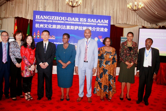 Mkurugenzi wa Bodi ya Utalii nchini(TTB) Devotha Mdachi na Bw. Qu Bo Naibu Mkurugenzi wa Utamaduni na Utalii jijini Hangzhou nchini China wakiwa katika picha ya pamoja na baadhi ya washiriki wa mkutano huo.