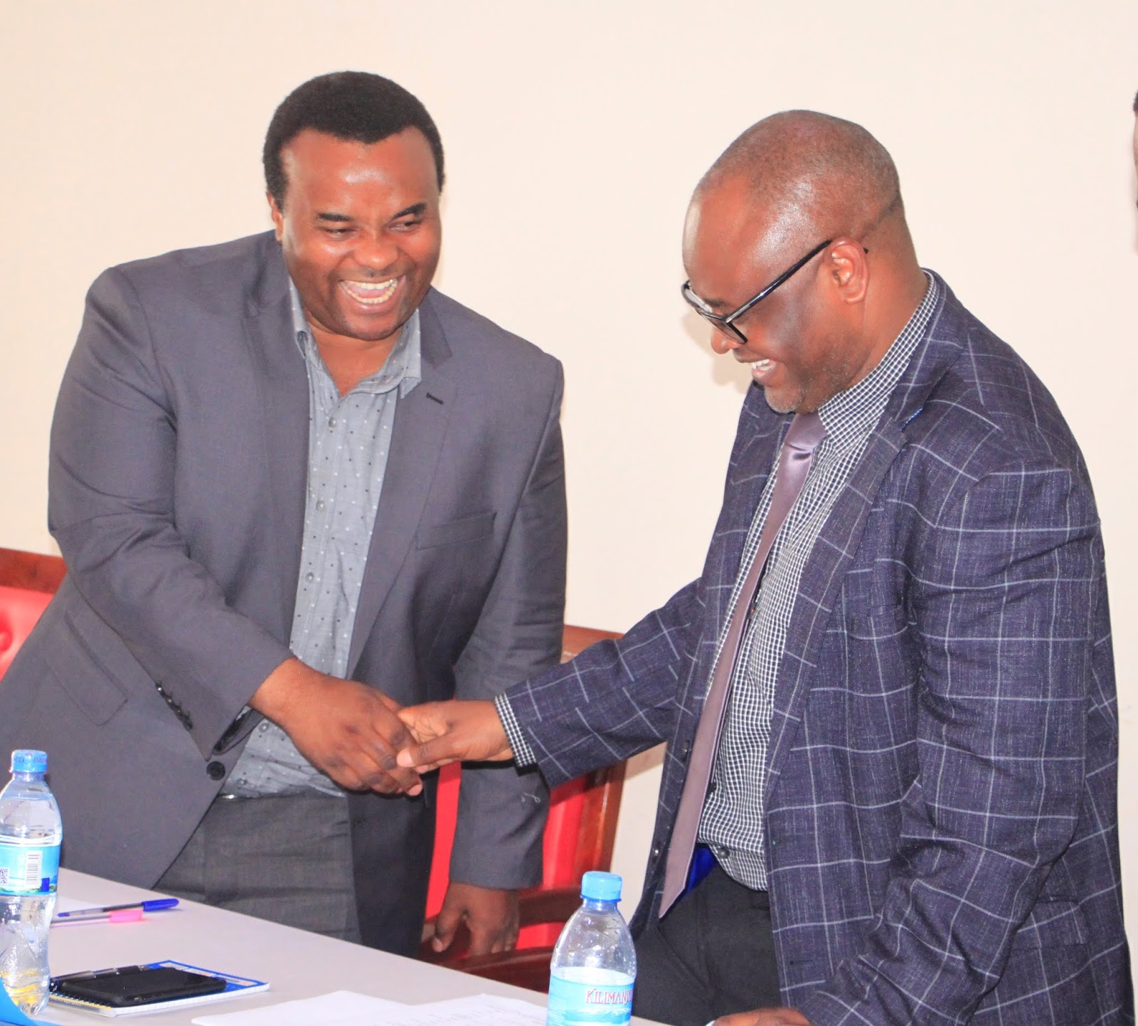 Naibu Katibu Mkuu Wizara ya Maji, Anthony Sanga (kushoto),akipeana mkono na Katibu Mkuu Wizara ya Maji, Profesa Kitila Mkumbo baada ya kufungua mkutano huo.