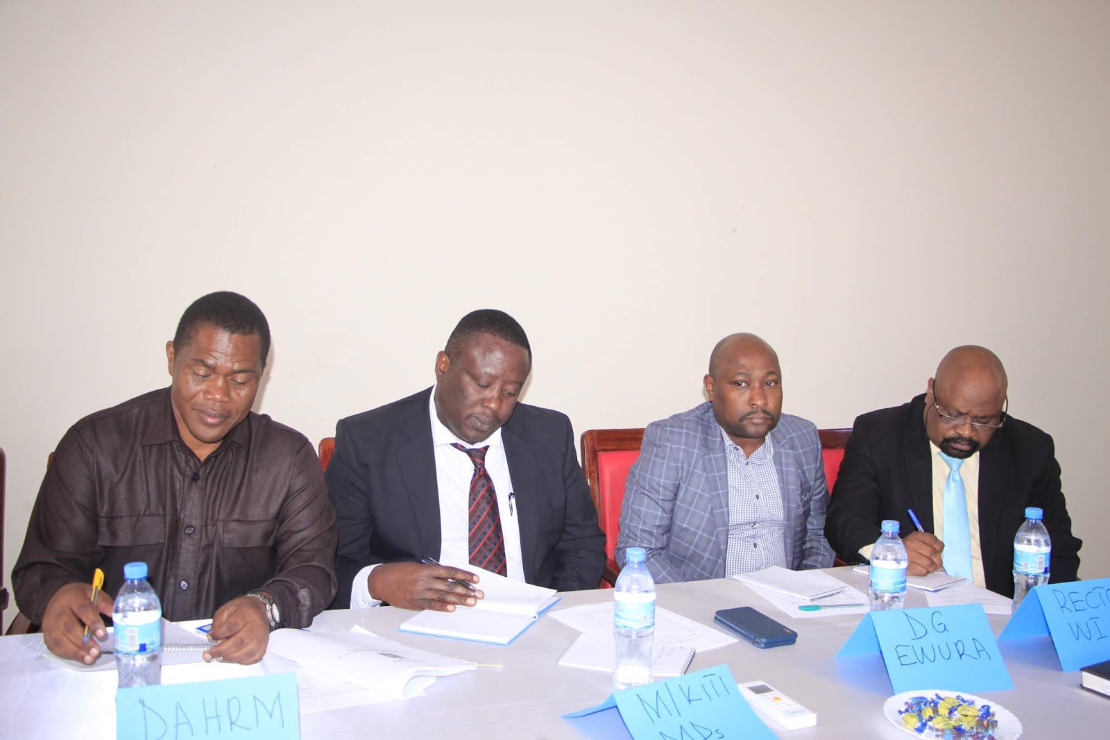 Viongozi mbalimbali wakiwa meza kuu. Kutoka kushoto ni Mkurugenzi wa Utawala na Rasilimali Watu, Barnabas Ndunguru, Afisa Mtendaji Mkuu wa Dawasa, Mhandisi Cyprian Luhemeja, Mwakilishi wa Mkurugenzi Mkuu Ewura, Lawrence Sawe na Kaimu Mkuu wa Chuo cha Maji, Adam Karia.