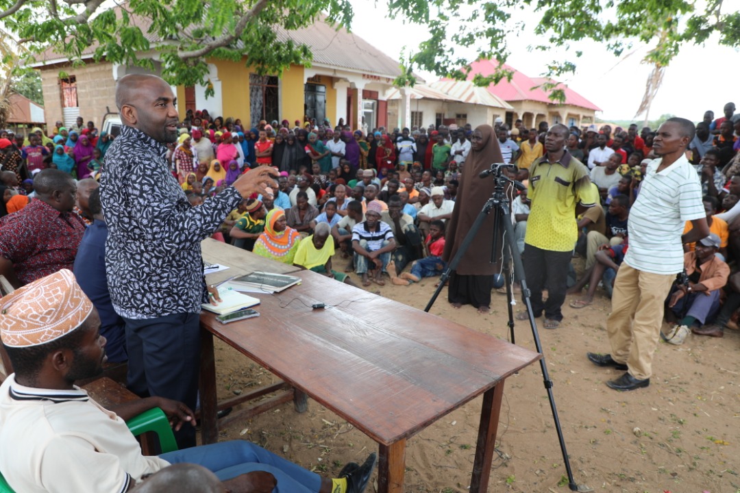 Mwananchi wa Kijiji cha Chikongo wilayani Tandahimba,Hassan Mkeli akimuuliza maswali Naibu Waziri wa Mambo ya Ndani ya Nchi, Mhandisi Hamad Masauni(watatu kutoka kulia), wakati wa mkutano wa hadhara uliofanyika kijijini hapo.Picha na Wizara ya Mambo ya Ndani ya Nchi.