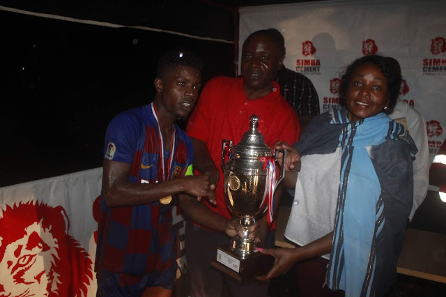 Mkuu wa kitengo cha Rasilimali watu wa Tanga Cement Diana Malambugi na mgeni rasmi wakati wa Fainali ya mashindano ya Idara ya Kiwanda cha Uzalishaji wa Saruji cha Simba Cement ambaye ni Meneja Uzalishaji wa kiwanda hicho Godwin Kamando katikati akikabidhi kombe kwa Nahodha wa timu ya Tassy Hassani Macho ambao walikuwa mabingwa wa mashindano ya mpira wa miguu