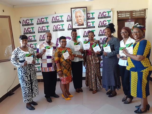 Viongozi mbalimbali wa chama cha ACT Wazalendo wakiwa katika picha ya pamoja na wageni wao kutoka TGNP Mtandao, wakionesha Ilani ya uchaguzi ya mwaka 2019 iliyotengenezwa na TGNP Mtandao kwa kushirikiana na wadau wengine wa haki za wanawake.
