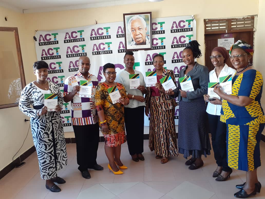 Viongozi mbalimbali wa chama cha ACT Wazalendo wakiwa katika picha ya pamoja na wageni wao kutoka TGNP Mtandao, wakionesha Ilani ya uchaguzi ya mwaka 2019 iliyotengenezwa na TGNP Mtandao kwa kushirikiana na wadau wengine wa haki za wanawake.