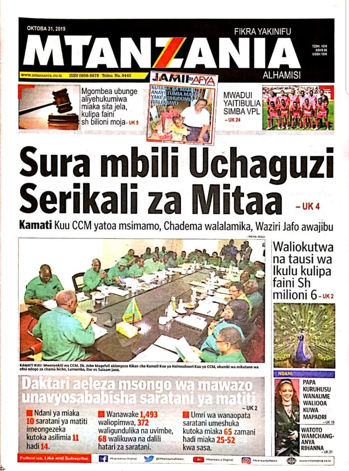 MagazetiPITIA VICHWA VYA HABARI KATIKA MAGAZETI YA LEO ALHAMISI OKTOBA 31,2019 Last updated: 2019/10/31 at 3:49 AM joseph 7 years ago Share SHARE joseph October 31, 2019 October 31, 2019 Share this Article Facebook Twitter Email Print Previous Article WAKALA WA USALAMA NA AFYA MAHALI PA KAZI (OSHA) YATOA SEMINA KWA WANACHAMA WA (CTI) Next Article MAVUNDE:SERIKALI KUENDELEA KULIWEZESHA KWA UJUZI KUNDI LA VIJANA NCHINI