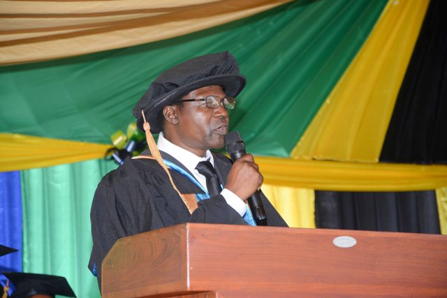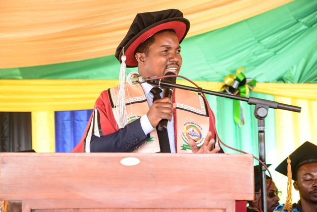Mkuu wa chuo cha Serikali za Mitaa Dkt. Mpamila Madale akiwasilisha hotuba wakati wa mahafali ya kumi na moja ya Chuo cha Serikali za Mitaa Hombolo