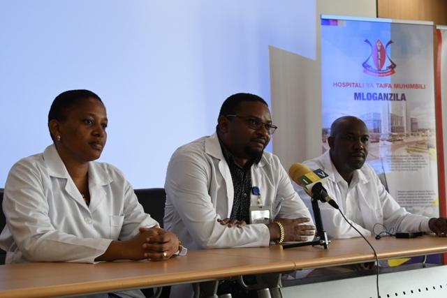 Daktari Bingwa wa Upasuaji Masikio, Pua na Koo wa Hospitali ya Taifa Muhimbili- Mloganzila, Dkt. Godlove Mfuko (katikati) akizungumzia zoezi la uwashwaji wa vifaa vya usikivu (Switch on) kwa watoto wawili waliopandikizwa vifaa vya kusaidia kusikia (Cochlear Implant) mwanzoni mwa Oktoba mwaka huu, kushoto ni Dkt. Aveline Kahinga na kulia ni Dkt. John Masago.