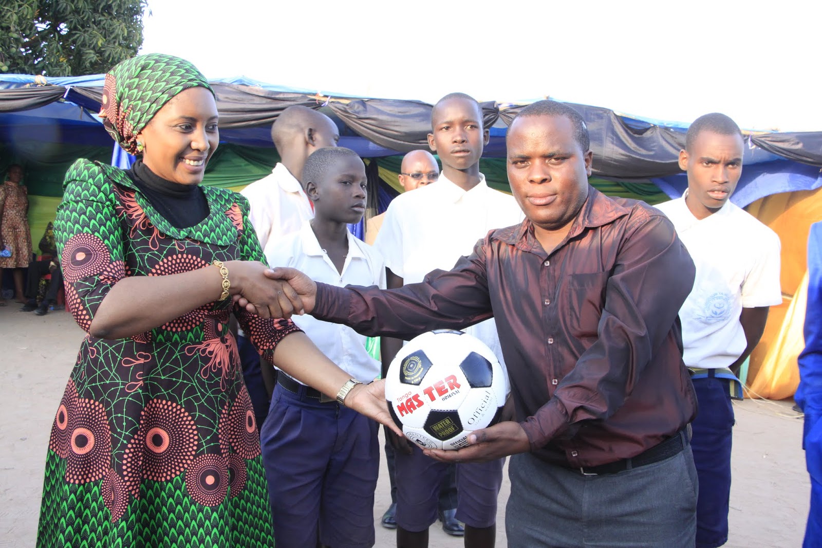 Mbunge wa Viti Maalumu (CCM) Mkoa wa Singida, Aysharose Mattembe, akimkabidhi mpira Mwalimu Paul Maduhu kwa ajili ya wanafunzi wa shule hiyo.