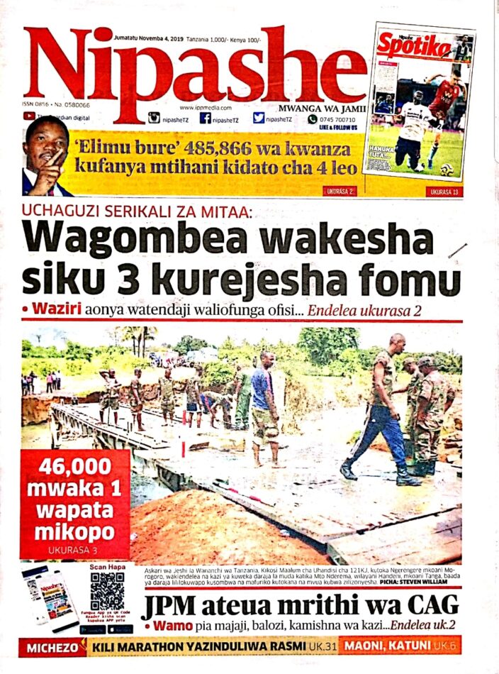MagazetiPITIA VICHWA VYA HABARI KATIKA MAGAZETI YA LEO NOVEMBA 4,2019 Last updated: 2019/11/04 at 3:19 AM Alex Sonna 6 years ago Share SHARE Alex Sonna November 4, 2019 November 4, 2019 Share this Article Facebook Twitter Email Print Previous Article IKUPA AWATUNUKU VYETI VYA MAFUNZO YA UJASIRIAMALI WATU WENYE WALEMAVU 200 Next Article YANGA YATUPWA NJE KOMBE LA SHIRIKISHO,YAPIGWA 3-0 PRYAMIDS YA MISRI