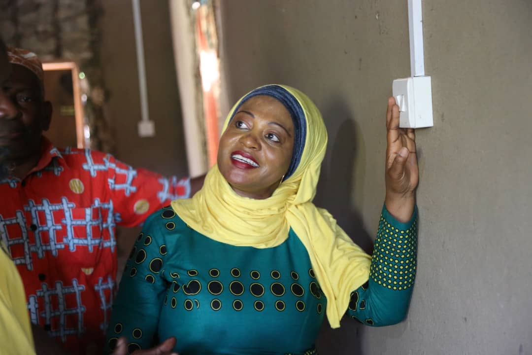 Naibu Waziri wa Nishati, Subira Mgalu, akiwasha umeme kwenye nyumba ya Bi Mtumwa Ally (hayupo pichani) katika kijiji cha Marimbani kata ya kiyegeani.