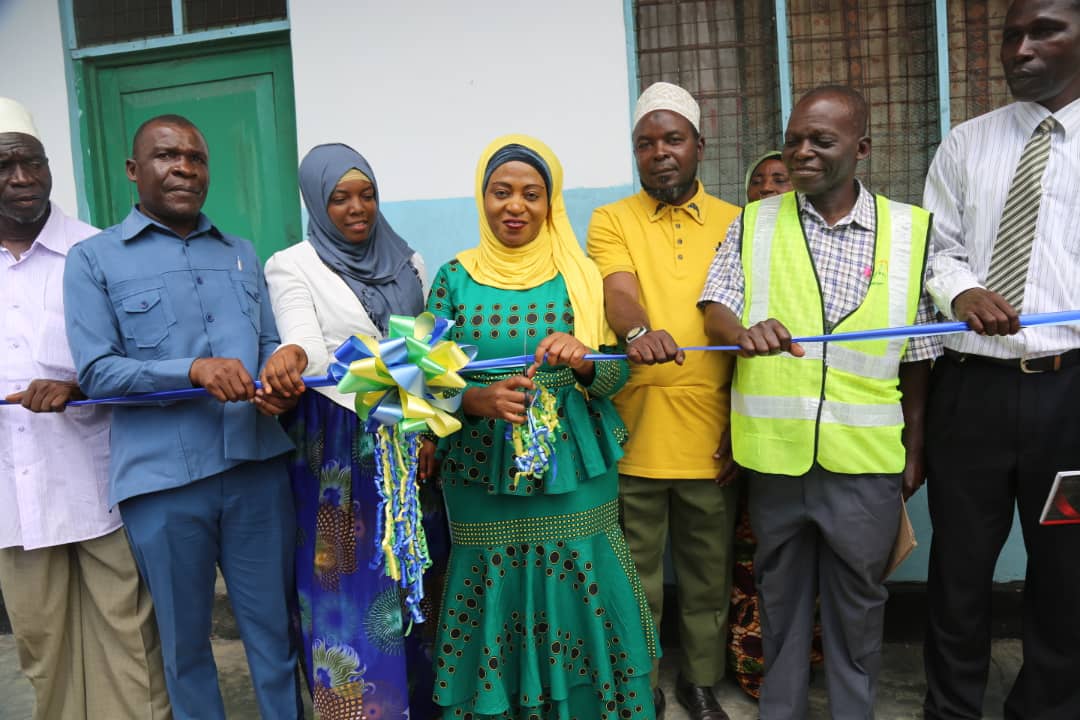 Naibu Waziri wa Nishati, Subira Mgalu, (wa nne kulia) akikata utepe kwenye nyumba ya Bi Rukia Muhammed Mbottoni (wa tatu kulia) katika kijiji cha Chemchem.