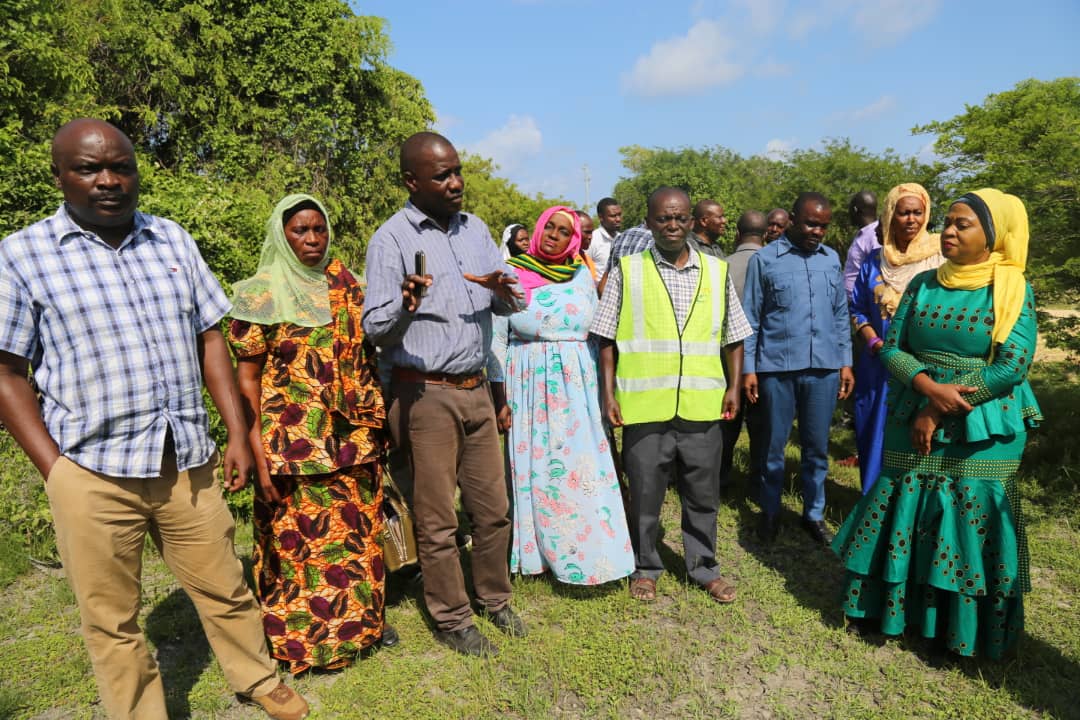 Naibu Waziri wa Nishati, Subira Mgalu (wa kwanza kushoto) akimsikiliza Afisa wa Ardhi wa Wilaya ya Mafia, Chuchu Ochere Silvery (wa tatu kulia) ambae alikuwa anampa maelezo kuhusu eneo lilitolewa na wananchi wa Kanga kwa ujenzi wa mradi wa umeme wa upepo wa megawati tano.