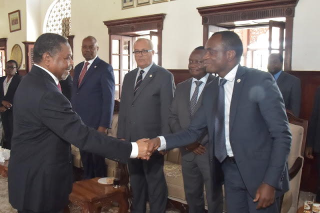 RAIS wa Zanzibar na Mwenyekiti wa Baraza la Mapinduzi Mhe.Dk. Ali Mohamed Shein akisalimiana na mgeni wake Rais wa Mahakama ya Afrika ya Haki za Binaadam na Watu.Mhe.Jaji Sylvain Ore, alipofika Ikulu Zanzibar kwa mazungumzo na Ujjumbe wake leo 7-11-2019.(Picha na Ikulu)