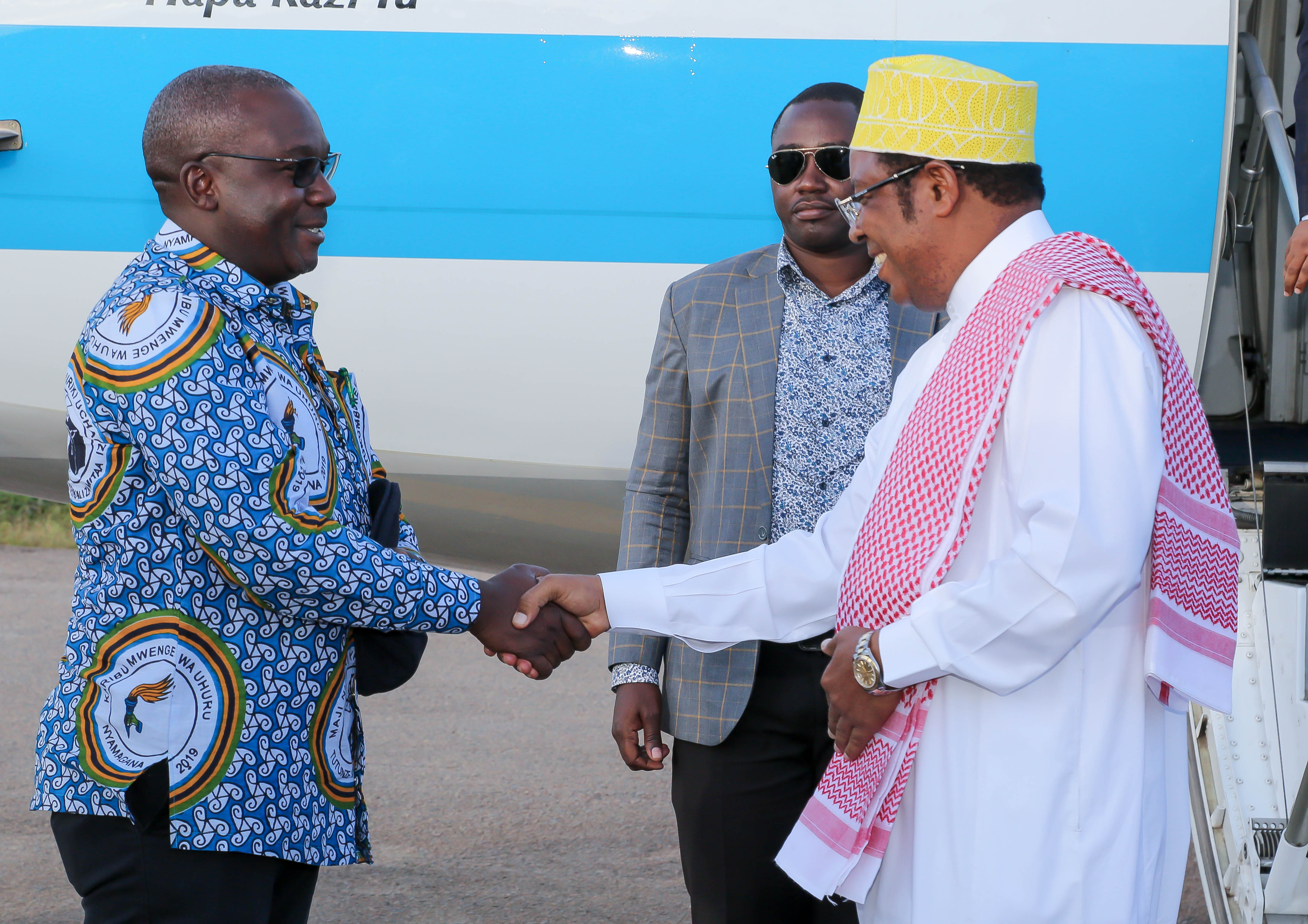 Waziri Mkuu, Kassim Majaliwa akisalimiana na Mkuu wa Mkoa wa Mwanza, John Mongela, wakati akiwasili kwenye uwanja wa ndege wa Mwanza, kumwakilisha Rais Magufuli, katika sherehe za Maulid, zitazofanyika mkoani humo. Novemba 9, 2019. (Picha na Ofisi ya Waziri Mkuu)