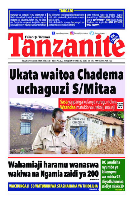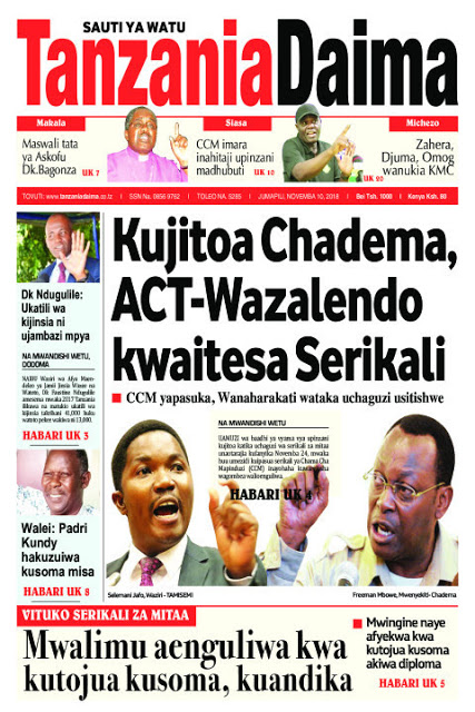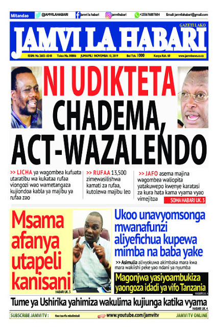 MagazetiPITIA VICHWA VYA HABARI KATIKA MAGAZETI YA LEO NOVEMBA 10,2019 Last updated: 2019/11/10 at 4:04 AM Alex Sonna 6 years ago Share SHARE Alex Sonna November 10, 2019 November 10, 2019 Share this Article Facebook Twitter Email Print Previous Article HEKTA 357.3 ZA ITOA ZAKABIDHIWA HALMASHAURI YA MJI NJOMBE Next Article PROF.NDALICHAKO AFUNGUA OFISI MPYA ZA UTHIBITI UBORA WA SHULE MISUNGWI NA SHINYANGA