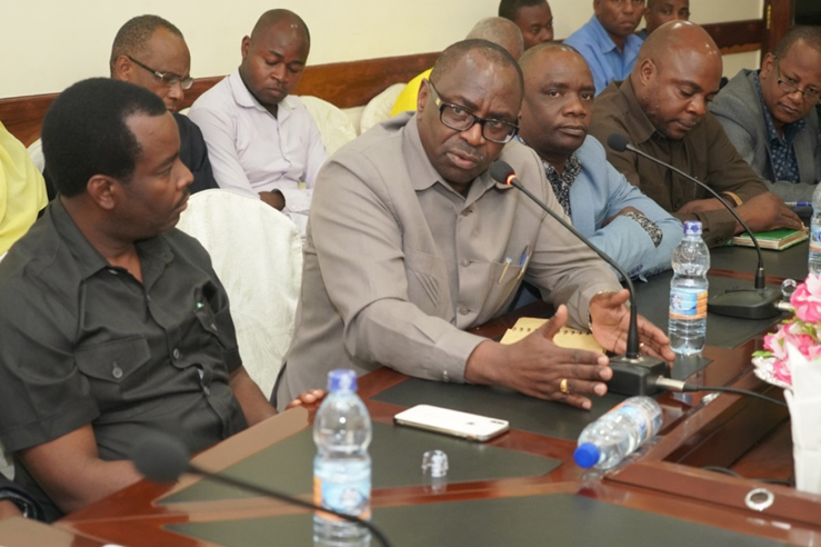 Mkurugenzi Mtendaji wa TASAF Ladislaus Mwamanga aliyevaa miwani) akisisitiza jambo kwenye mkutano wa viongozi wa SMZ juu ya utekelezaji wa shughuli za TASAF .