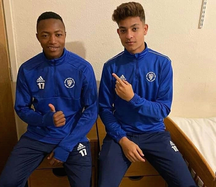 Mshambuliaji wa kimataifa wa Tanzania, Kelvin John akiwa na chipukizi mwenzake wa akademi ya Leicester City katika kambi yao, Holmes Park, Belvoir Drive Training Complex jana. Kelvin amejiunga na academy ya Leicester City kufuatia kwenda England kwa masomo
