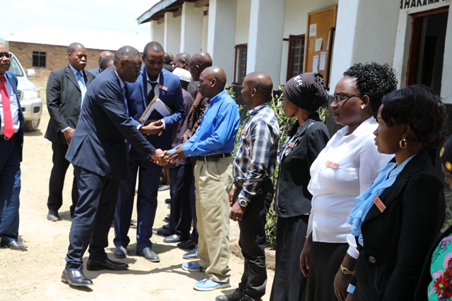 Jaji Mkuu wa Tanzania Mhe.Prof.Ibrahim Hamis Juma,akisalimiana na watumishi wa mahakama ya wilaya ya Kalambo mara baada ya kuwasili kukagua shughuli za mahakama akiwa katika ziara ya kikazi Mahakama kuu ya Tanzania kanda ya Sumbawanga Mkoani Rukwa.