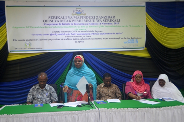 Mkurugenzi wa Idara ya Takwimu za Kijinsia na Kidemografia na kijamii Khadija Khamis Hamad akitoa hotuba ya ufunguzi wa Mkutano wa Wadau kwa kuhamasisha Takwimu za Kijinsia Uliofanyika katika ukumbi wa Ofisi ya Mtakwimu Mkuu wa Serikali Mazizini Zanzibar Ikiwa ni shamra shamra za Maadhimisho ya Siku ya Takwimu Afrika ambapo itafikia kilele chake 18/11/2019.