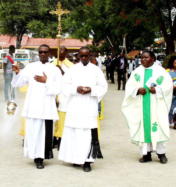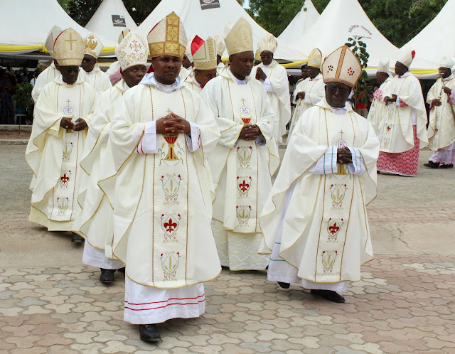Askofu wa jimbo la Shinyanga Liberatus Sangu akiingia kanisani kuadhimisha jubilee yake ya miaka 25 ya Upadri.