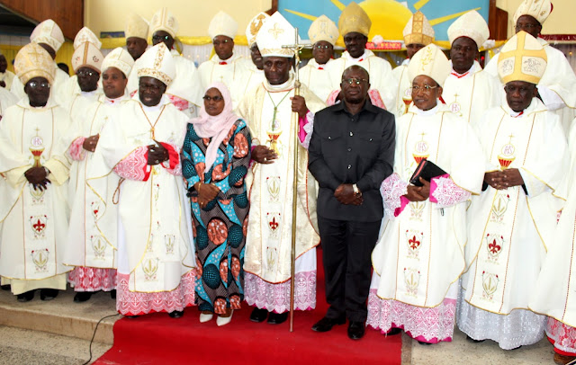 Askofu wa jimbo la Shinyanga Liberatus Sangu katikati akipiga picha ya pamoja na Maaskofu pamoja na viongozi wa Serikali akiwemoWaziri wa Habari, Utamaduni, Sanaa na Michezo Dkt. Harrison Mwakyembe mwenye kaunda suti pamoja na mkuu wa mkoa wa Shinyanga Zainab Telack mwenye ushungi kichwani.