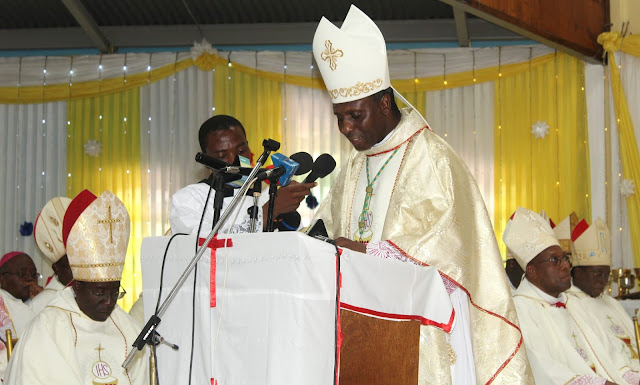 Rais wa Baraza la Maaskofu Katoliki Tanzania,Askofu Gervace Nyaisonga akitoa salama kwa niaba ya maaskofu wa kanisa hilo, kwenye maadhimisho ya jubilee ya miaka 25 ya updare wa Askofu wa jimbo la Shinyanga Mhashamu Liberatus Sangu.