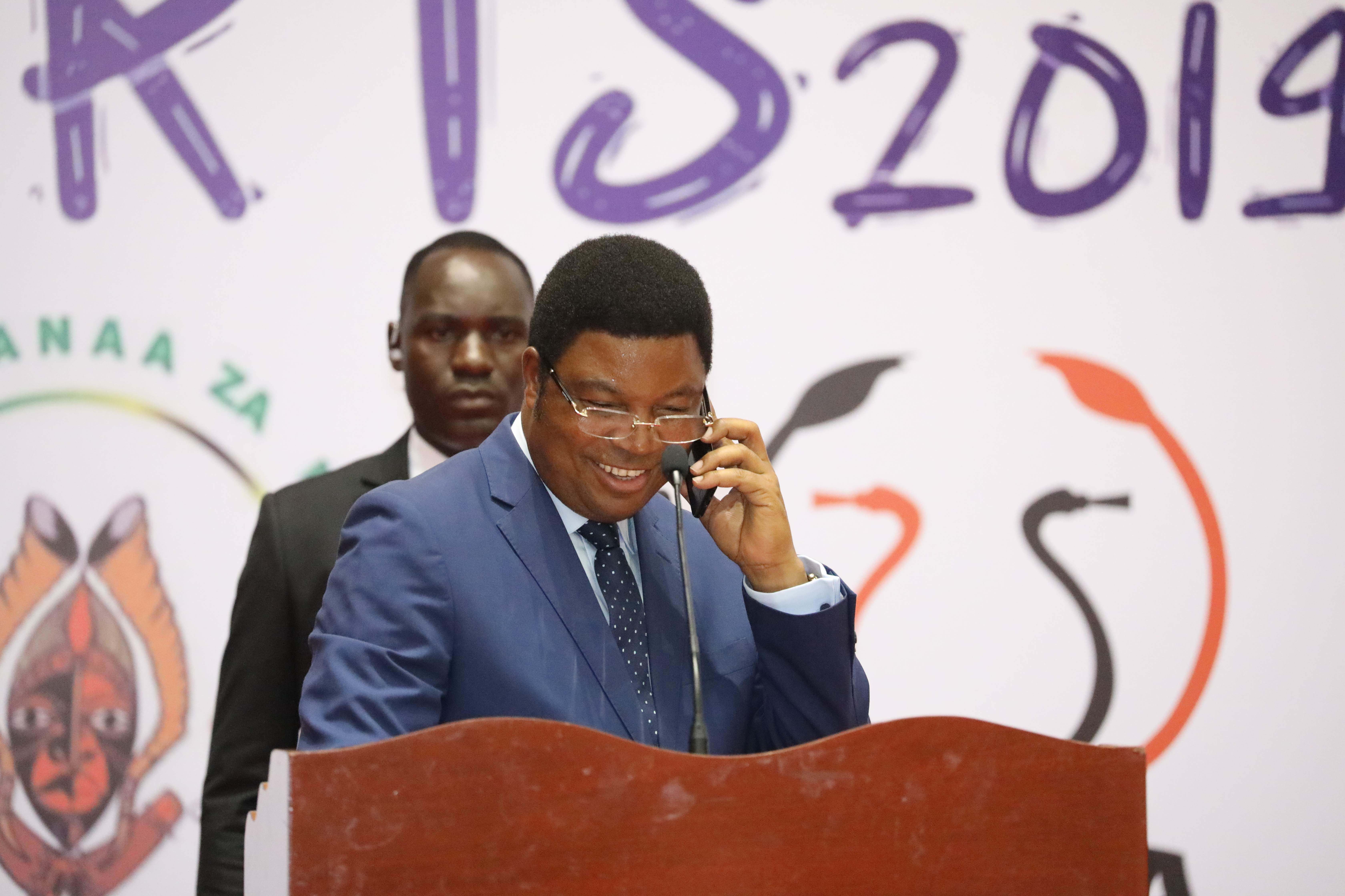 Waziri Mkuu wa Jamhuri ya Muungano wa Tanzania, Mhe. Kassim Majaliwa akisikiliza simu ya Rais wa Jamhuri ya Muungano, Mhe. Dkt.John Pombe Magufuli alipopiga kuwapongeza wasanii kwa kuanzisha tamasha la Mwalimu Arts Festival 2019, aliyeshikilia simu hiyo ni Rais wa Shirikisho la Muziki Nchini Ado Novemba.