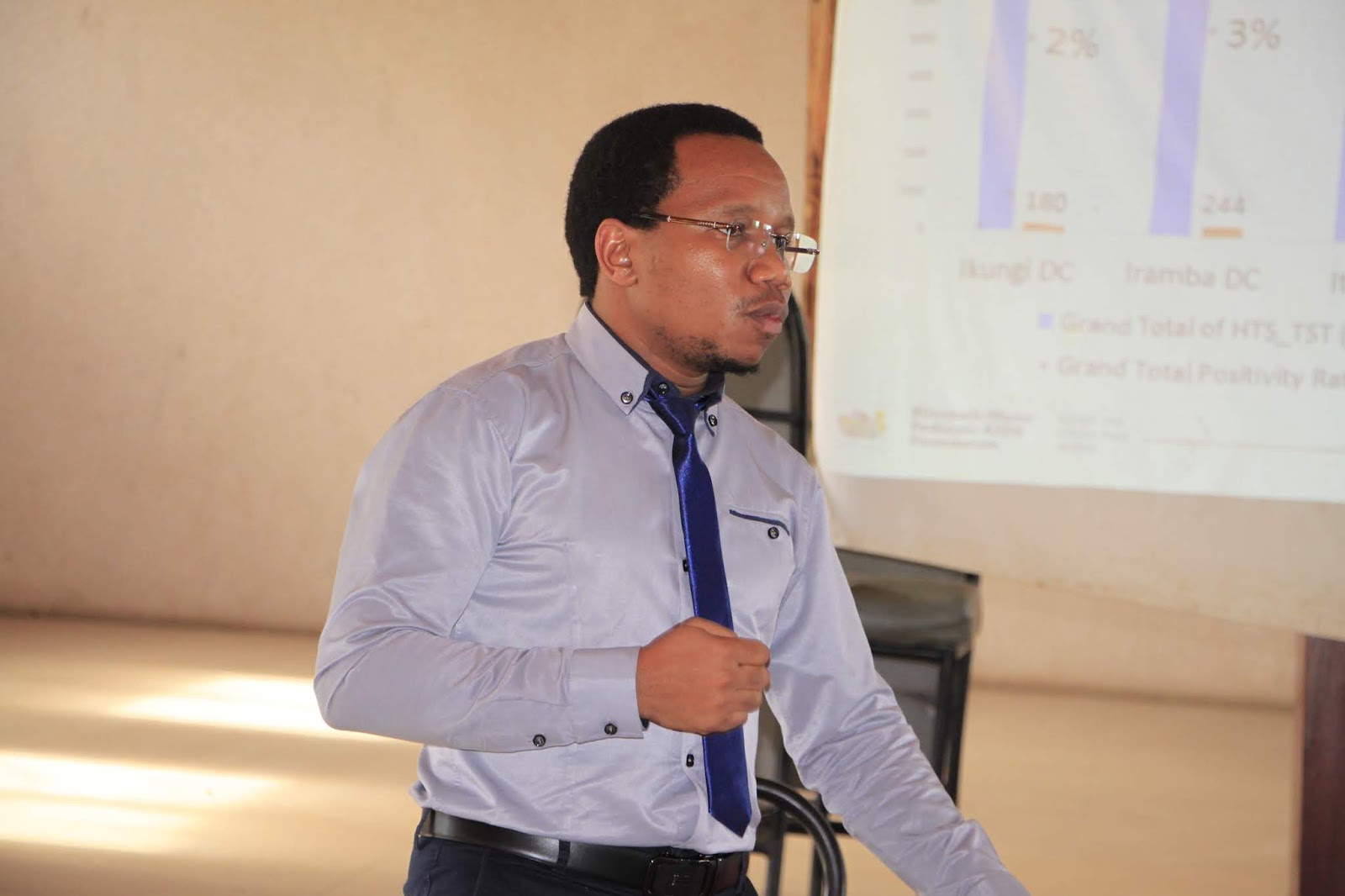 Meneja Mwandamizi kutoka USAID Boresha Afya (EGPAF), Charle Makoko, akitoa mada kwenye kikao hicho.