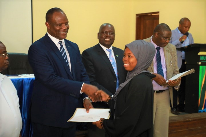 Waziri wa Kilimo Mhe Japhet Hasunga (Mb) akimkabidhi zawadi ya cheti Salama S. Mnipa mwanafunzi bora anayesoma Shahada ya Benki na Fedha mwaka wa pili Chuo cha Usimamizi wa fedha (IFM) Jijini Dar es salaam leo tarehe 14 Novemba 2019.
