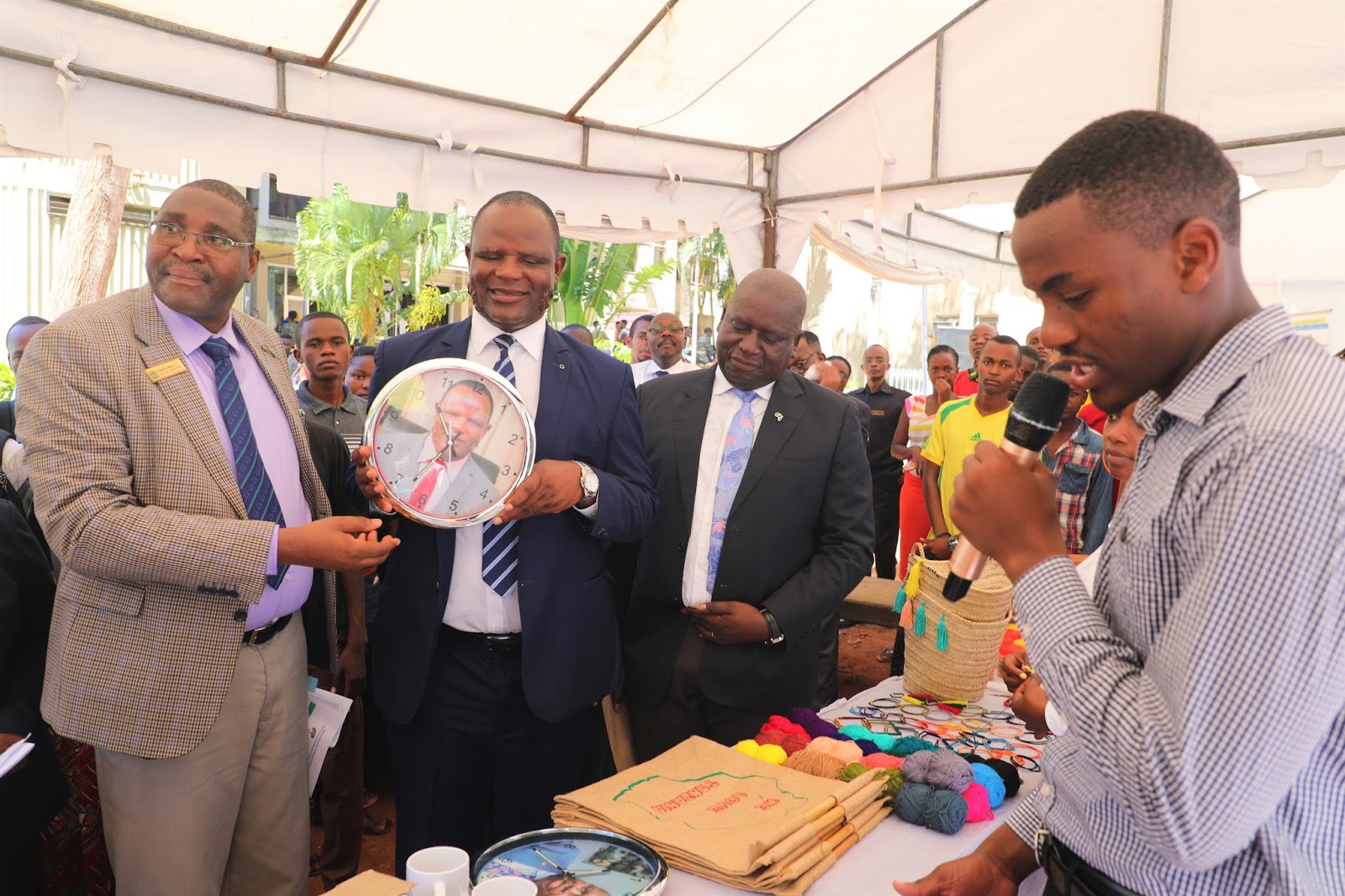Waziri wa Kilimo Mhe Japhet Hasunga (Mb) akionyesha saa ya ukutani ambayo ina picha yake mara baada ya kutembelea mabanda ya maonesho ya Teknolojia ziazofundishwa na Chuo cha Usimamizi wa fedha (IFM) Jijini Dar es salaam leo tarehe 14 Novemba 2019.