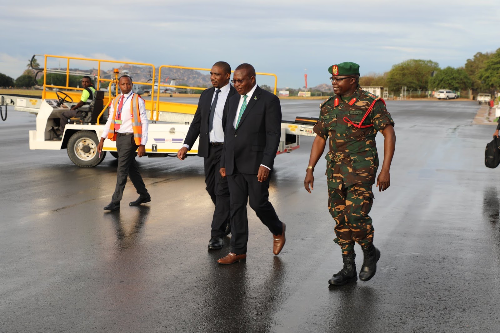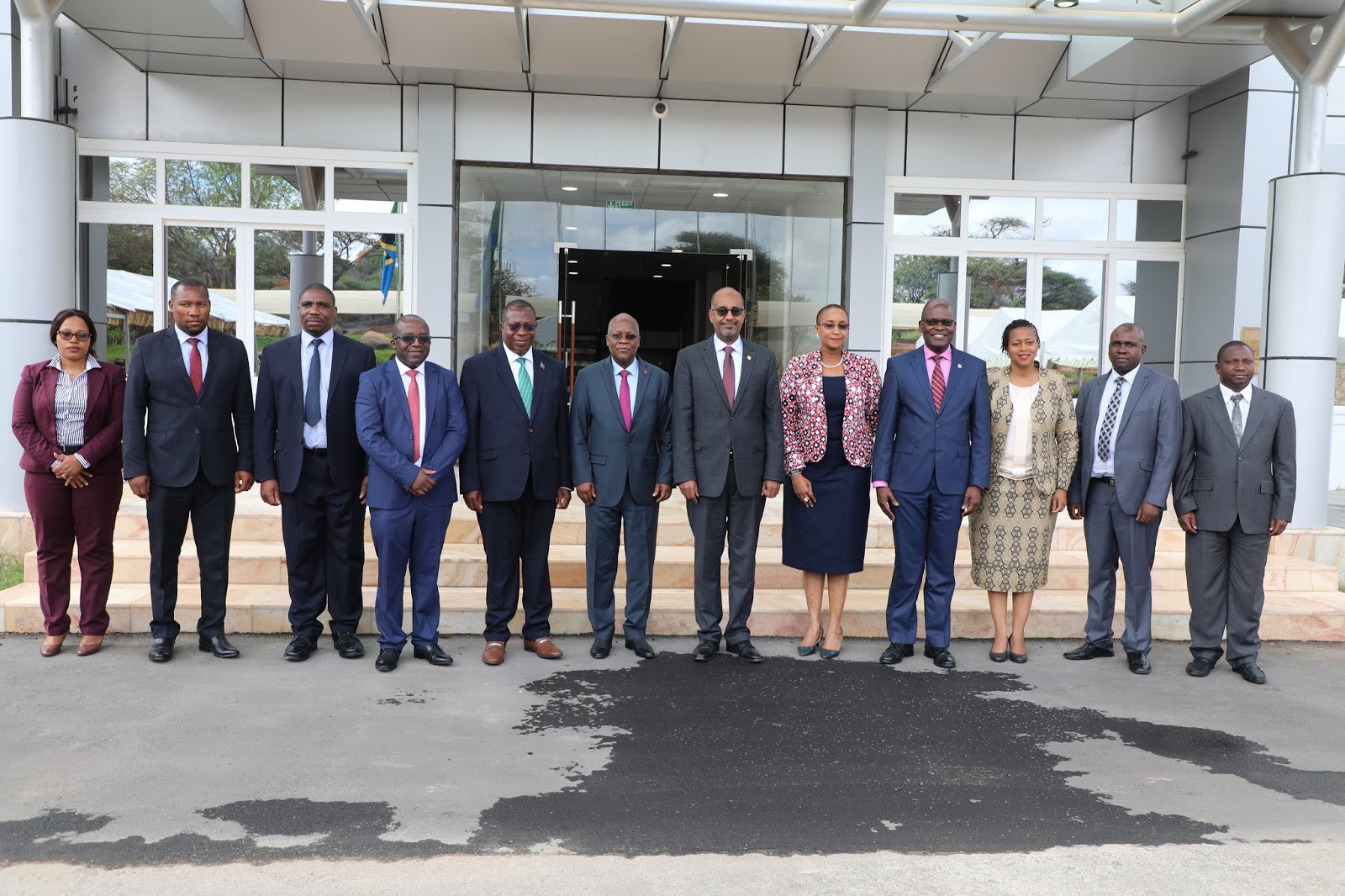 Viongozi na Watendaji wa Serikali wakiwa na Rais wa Benki ya Maendeleo ya Biashara Mashariki na Kusini mwa Afrika (TDB) Bw. Admassu Tadesse mara baada ya kumlaki katika uwanja wa ndege jijini Dodoma. |