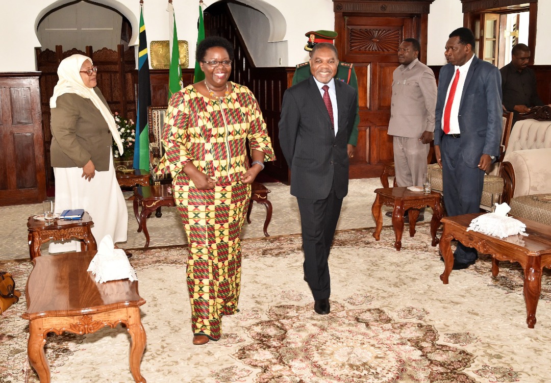 RAIS wa Zanzibar na Mwenyekiti wa Baraza la Mapiunduzi Mhe.Dk. Ali Mohamed Shein akiwa na mgeni wake Mwakilishi Mkaazi wa (UNDP) Nchini Tanzania.Bi.Christine Musisi, wakitabasamu wakati wakitoka katika ukumbi wa mkutano baada ya kumaliza mazungumzo yao yaliofanyika leo 25-11-2019, katika ukumbi wa Ikulu Jijini Zanzibar.(Picha na Ikulu)